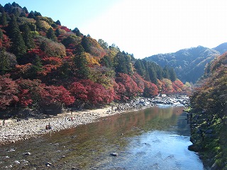 #624 紅葉に色づく香嵐渓の風景(愛知県豊田市) (2024年11月23日執筆) 2011年11月26日、愛知県豊田市足助地区の紅葉の名所、香嵐渓の風景です。本サイトでも昨年に別の香嵐渓の写真を題材にしましたが、紅葉が青空の下とても美しかった香嵐渓の風光は本当に筆舌に尽くしがたいものでしたので、今年も兼題として俳句を詠ませていただくことといたしました。