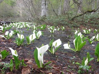 #81 尾瀬・テンマ沢湿原の水芭蕉(群馬県片品村) (2023年5月30日執筆) 今回から90回目までは、尾瀬の初夏のハイキングの中で撮影した写真を題材に俳句を詠んでいきます。鳩待峠から尾瀬ヶ原の西の入口にあたる山ノ鼻エリアへ下る山道で最初に出会う湿原がテンマ沢の湿原です。ここでも水芭蕉の群落を観察することができまして、朝早く鳩待峠を出発すると、ちょうどこのあたりから朝日が射して、森がスポットライトを当てられたように輝きます。その日光に照らされた水芭蕉の葉の生き生きとした様子を捉えました。