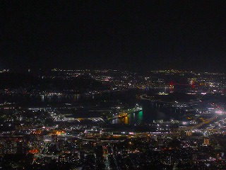 #976 皿倉山から眺めた北九州市の夜景(北九州市八幡東区) (2025年11月10日執筆) 2025年11月8日、北九州市八幡の皿倉山から眺めた夜景です。洞海湾を中心に広がる北九州市の工業地帯や、背後の市街地が鮮やかな光に包まれる風景です。そのなかに楔のように入り込む洞海湾が黒く横たわり、2022年に重要文化財に指定された若戸大橋が赤くライトアップされて、地域のシンボルとして輝いていました。