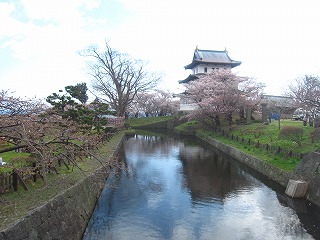 禅林街を散策した後は、いよいよ弘前城方面へと歩を進めます。禅林街は弘前城から見て西南の位置にあたり、その立地は岩木川のつくる段丘崖の突端に位置する城下の守りの要衝としての役割も持っており、長勝寺境内付近の一帯は特に弘前城の出城としての機能を持つ「長勝寺構」と呼ばれました。その岩木川と東の土淵川に囲まれた南北に細長い台地上に計画された弘前城は、城郭のみならず城下町全体を防衛するよう計画されました。桜で彩られる天満宮境内を経ますと、その城下町の中心にあって堀をめぐらす弘前城周辺は間近となります。弘前市は1889(明治22)年に市制・町村制が創始された際に最初に市となった31の都市のひとつです。前述の台地の先端にある弘前城の周辺は弘前市街地の中心であり、公共施設や商業施設が多く集積しています。その中で、青森銀行記念館の洋風建築が目を引きました。1904(明治37)年建築というその建物は、当時の名匠の手によるもので、近代建築に確かな技術で挑んだ往時の人々の気概を感じさせます。 弘前城の外濠沿いのソメイヨシノは満開を迎えていまして、水面にはみずみずしい花筏がやさしく漂っていました。観桜客が徐々に増え始めた午後、市役所に相対する追手門より城内へと進みます。ソメイヨシノはどの木もめいいっぱいの花を咲かせていまして、目眩く晩春の情景を最高潮に演出していました。園内の広葉樹もみずみずしい新緑を芽吹かせ始めていまして、すべての歓喜がこの時期に一斉に訪れる「みちのくの春」を存分に感じさせました。外濠の内側は三の丸で、杉の大橋が架かる中濠を越えると二の丸となります。枡形となっている南内門を越えて土塁を回り込むようにして歩きますと、内堀に囲まれた本丸へと導かれます。その工程の間にもたくさんのソメイヨシノやシダレザクラがしなやかな樹冠を春風にそよがせていまして、春の暖気がこの一点に凝縮されたような風景が目の前に連続していきます。中には壮大に滝のような枝を迸らせる大しだれもあって、驚かされます。