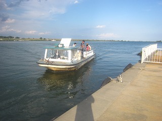 利根川右岸の堤防上の道を上流へととって返します。福川の合流点でやや迂回する形になりますが、概ね堤防の上を歩いて行きますと、上述の葛和田地区の渡し船の発着点へとたどり着くことができました。周辺の景観は、水田に麦が植えられた田園風景で、埼玉県北部と群馬県下が風土を一にしていることが理解されるものでした。対岸の千代田町側へ乗船の意思表示をするために、黄色い旗を揚げます。やってきた渡船に乗り込み、利根川の広い流れを渡って、赤岩へと戻りました。船から観察する利根川の水面はとても軽やかに行き過ぎて、この流れが長い歴史の中で物流を担い、人々の生活を支えてきたことを改めて実感しました。 |