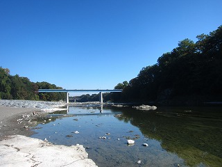 寄居はこれまで山中を流れてきた荒川が関東山地から関東平野へと出る位置に発達した、いわゆる「谷口集落」と呼ばれる町場です。秩父往還(現在の国道140号がおおよそそのルートを踏襲しています)上の重要な宿駅として機能していました。駅南口を出発し、玉淀駅方面へ穏やかな市街地を進みます。本町交差点で交差する県道296号の道筋が寄居の中心市街地です。明治期の地勢図を確認しても、荒川左岸の開けた平坦地を貫通する往還上に発達した街村としての町並みが表現されています。現在はこの昔からの市街地の北に駅ができて、さらにその北側に国道がバイパスとして通過し、その間の空間の市街化も進んでいます。寄居の中心市街地は訪れたこの時も幹線道路に面して商店街が形成されていまして、蔵造りの建物と現代の建築物とが混じり合う穏やかな景観によって整えられていました。 玉淀駅の手前でクランクする道路の形状は藩政期と変わらないものです。そのまま東上線の鉄路に沿って住宅地を進みますと、程なくして荒川のほとりへと到達します。河畔の林の間からはあらかわのながれがきらきらと秋の日射しを受けているのが見えます。閑静な宅地の囲まれるようにして、玉淀水神宮が祀られています。「玉淀(たまよど)」とは、この寄居市街地の南一帯の荒川の河原の名称です。現地に設置された表示板によりますと、1931(昭和6)年に「玉淀」と命名されたとのことのようです。水天宮は玉淀の名が生まれた際に神社を造営しようとした際に水神を祀った祠があることが分かり、社殿を建立し水天宮としたものであるとのことです。県道30号を横断し川に沿って歩きますと、玉淀の河川敷へと下りることができる場所へと辿り着きます。川の南岸は鉢形城跡であり、その要害は荒川の作る絶壁の上に存立していました。豊かな緑と川を洗う岩、木々を映す穏やかな淀みの色彩とが、晩秋から初冬へと移り変わる途上のゆるやかな日の光に照らされて、のびやかな情景を現出していました。