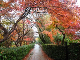 中央卸売市場の施設群を抜け、JR丹波口駅から嵯峨野線を利用し、JR嵯峨嵐山駅へ。渡月橋から眺める嵐山の風景は、所々に赤く染まった木々や乳白色の霧を山肌にまとって、灰色の空の下、幽玄の絵巻の中にありました。保津川に沿って亀山公園方面に歩く道すがらのカエデも徐々に色づいて、雨露を滴らせる風景は、川面が見せる翡翠色の微光もあいまって、非常に美しく目に映ります。 野宮神社付近の竹林の道を歩き、大河内山荘の東を曲がって小倉池のほとりを北へ進み常寂光寺の門前へと抜けるルートは、紅葉の木々の下を気持ちよく散策できるルートとしてシーズンには多くの人通りがあります。枝いっぱいに燃えるような赤や黄色を散りばめる樹上の紅葉はもちろんのこと、足元に敷き詰められた落ち葉や山茶花の垣根に降り積もる様も実に味わい深くて、快い気持ちになれるルートです。嵯峨野を見下ろす常寂光寺の境内はまさに晩秋・初冬の装いで、紅葉と小雨、靄に濡れる嵯峨野の景色とともに、この上ない情趣に浸ることができました。