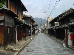 そんな宮島町の中心部は、歴史的なムードに満ちた、懐かしい雰囲気の色濃い落ち着いた街並みの宝庫でした。土産物店が並ぶ表通りを歩いたのでは絶対に出会えない、瀬戸内の古い街並みは、見事という他ありません。厳島神社や大元神社を見た帰路に、千畳閣から見下ろした街並みのたおやかさに惹かれ実際に街中を歩いて見ましたが、そのあまりの奥ゆかしさに、路地を歩いていてとても晴れやかな気持ちになりました。 広島へ帰るため、再び桟橋方面へと歩き始めました。大鳥居を介して望む、海の向こうの本州は、広島大都市圏の拡大に呼応してつくられたと目される多くの団地たちが、丘陵の上にモザイク状に分布する景観でした。 |