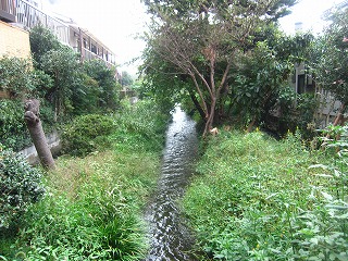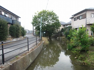 明治期の地勢図を確認いたしますと、JR稲城長沼駅北を東西に貫く旧川崎街道とともに、葎草橋通りに相当する道も描かれていまして、歴史の古い往来であることが分かります。通りに沿うように流れる菅堀(すげぼり、後述の大丸用水の分流の1つ)に架かる橋が通りの名前になっている葎草橋で、1838(天保9)年に石橋に架け替えたとする石碑が建てられています。この橋は藩政期の押立村と長沼村(現在の東長沼にあたる)の境界にもなっていて、交通上の要衝の位置を占めていました。なお、多摩川を挟んだ対岸にも押立の地名がありますとおり、押立村は多摩川の両岸に村域を持っていました。1949(昭和24)年に多摩川南岸の部分は当時の稲城村に編入されています。現在の葎草橋通りは住宅地域の中に梨畑が点在する地域の中を続く小街路となっていて主要道路出会った面影はありません。道路は多摩川に行き当たって渡船が連絡していました。是政橋が1942(昭和17)年に架けられ廃止されるまで、この渡船は地域の足として機能していたようです。 多摩川河畔のアカシア林を一瞥しながら稲城大橋方向へ戻り、橋上から多摩川の流れと丘陵に向かって展開する稲城市内の街並みを遠望しました。これまで歩いてきた東長沼や押立のある多摩川右岸の低地帯は、元来水田を中心とした農業地域であったようです。この地域を貫流し矢野口地区を経て川崎市多摩区へと流下する大丸(おおまる)用水は、市域西部の大丸地区から多摩川より取水し、地域の灌漑に重要な役割を果たしてきました。丘陵地に抱かれた田園地帯は首都圏近郊のベッドタウンとして都市化がむ一方、丘陵上は日本最大規模の多摩ニュータウンへと変貌していきました。第四文化センター通りと名付けられた街路を南に入り、いちょう並木通りを西へ進みますと、一直線に進む道路にとりつくように蛇行する大丸用水(菅堀)が往時のたおやかさを変わらずに示しているように感じられます。思いのほか清冽に見える流れは、団地の間を通り、梨畑の横を駆け、時に緑地を抜けながら美しいカーブを描いていました。大丸地区会館南で新堀が分流していまして、この付近では現役の水田も認められました。分流点付近には大丸庭園と呼ばれる小公園が整備されています。この付近からJR南多摩駅近くまで、一部親水公園として整えられた用水端の散策を楽しみました。こうして地域の姿を映す用水や水田の風景、そしてそれらを囲むように成長した現在の住宅地域の風景は、地域の今昔をゆるやかに表現していまして、本当に気持ちの良いウォーキングを楽しむことができました。